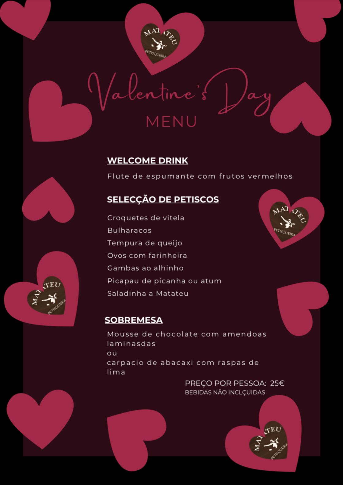 Durante o período do jantar o seu Matateu está pronto a recebê-lo, na nossa esplanada de sempre.